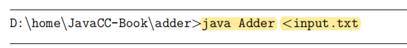 Adder的类,当然在这个块中定义的并非是Adder类的全部,JavaCC会根据.jj描述文件的其他部分的描述,来生成Adder的其他声明信息。另外注意到,在该类的main方法声明中,