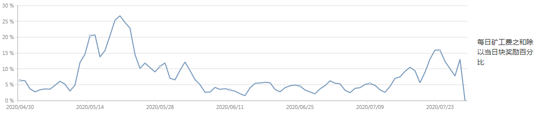 图:每日矿工费之和除以当日区块奖励所得的百分比